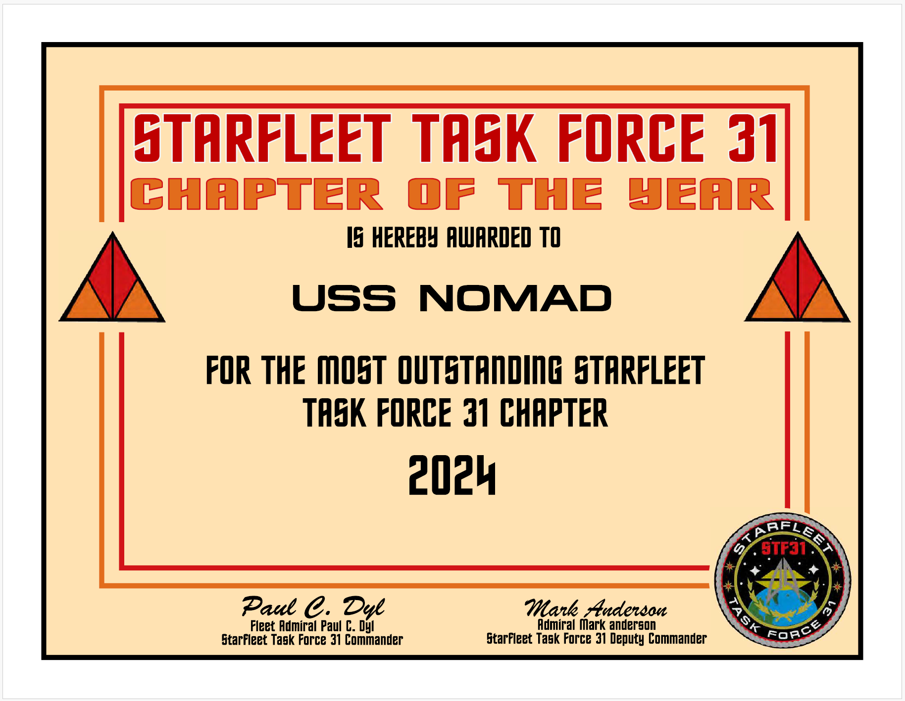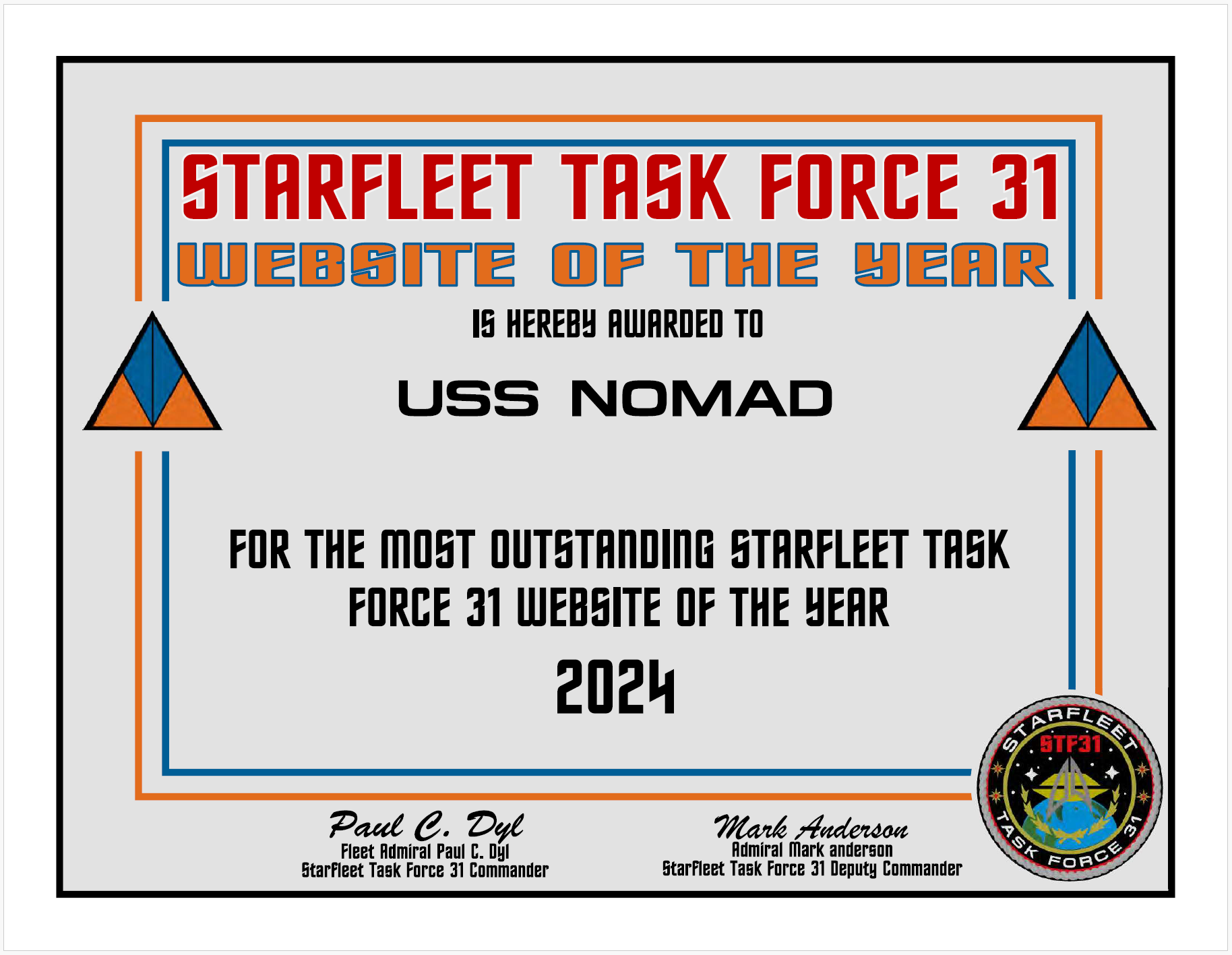 Awards- USS Nomad The following are awards that the USS Nomad has earned over her years of service. Starfleet Task Force 31 Awards Sector Awards Chapter Certifications